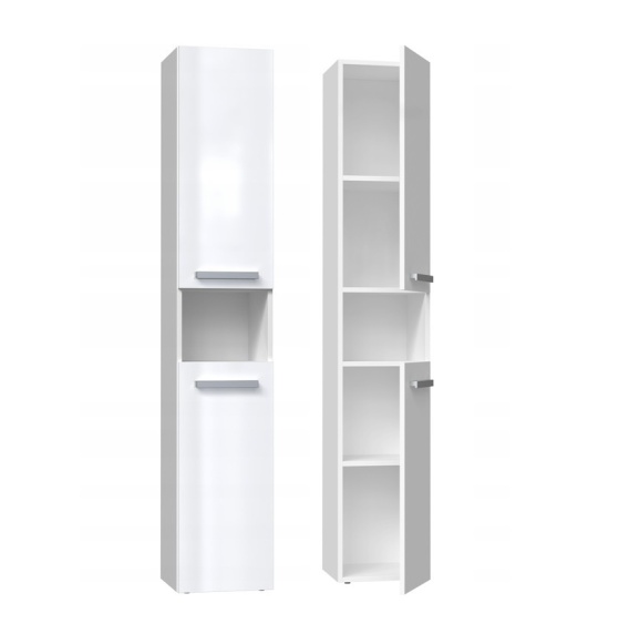 Biała szafka do łazienki LAZ-1313-BIEL-POŁ przyciąga wzrok swoim eleganckim wyglądem. Lakierowane fronty na wysoki połysk nie tylko pięknie się prezentują, ale również dodają wnętrzu świeżości i nowoczesności. Biały kolor jest najbardziej uniwersalny, dzięki czemu szafka będzie idealnie pasować do każdej aranżacji, niezależnie od stylu łazienki. Dodatkowo, srebrne uchwyty podkreślają nowoczesny charakter mebla, dodając mu subtelnej elegancji.