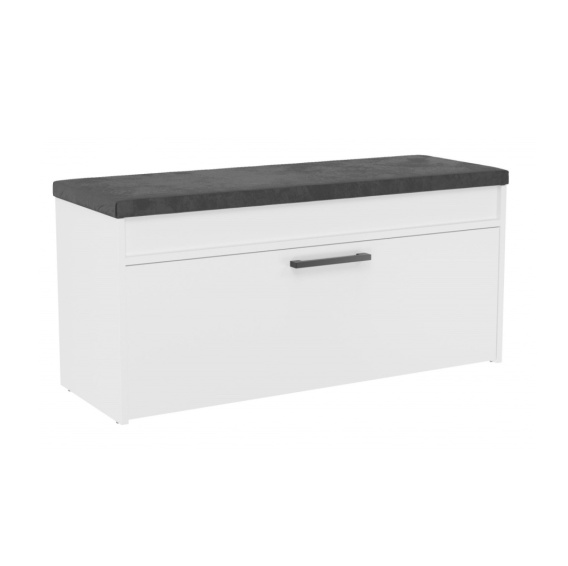 W górnej części szafki znajduje się wygodne, welurowe siedzisko w kolorze ciemnoszarym, wypełnione miękką gąbką, które zapewnia komfort podczas zakładania lub zdejmowania obuwia. Co więcej, podnoszone siedzisko skrywa dodatkowy, praktyczny schowek. To idealne miejsce na przechowywanie butów sezonowych, czapek, szalików, kluczy lub innych drobiazgów, które chcesz mieć zawsze pod ręką.