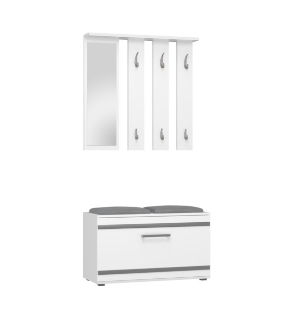 Dolną część mebla stanowi biała szafka na buty z uchylnymi drzwiami wyposażonymi w dwie poziome listwy ozdobne w kolorze srebrnym. Wewnątrz znajdują się cztery praktyczne półki, które pomieszczą zarówno obuwie codzienne, jak i sezonowe. Na górze umieszczono dwa miękkie siedziska w kolorze szarym, wypełnione gąbką, zapewniające wygodę podczas zakładania lub zdejmowania butów.