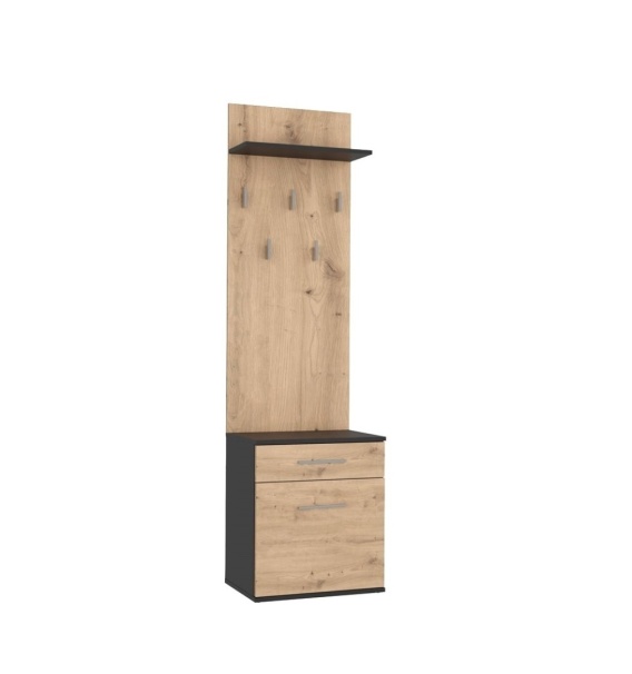Zestaw składa się z dwóch starannie zaprojektowanych elementów: panelu z wieszakami i pojemnej szafki na buty. Górna część mebla to praktyczny wieszak z pięcioma haczykami, idealny na płaszcze, kurtki, torby czy apaszki. Nad nim znajduje się funkcjonalna półka, na której możesz przechowywać czapki, kapelusze lub drobiazgi, które warto mieć zawsze pod ręką.