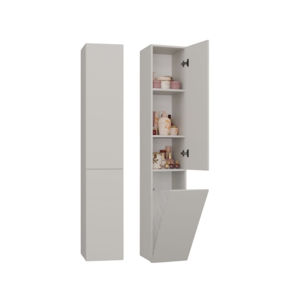 Za górnymi, dłuższymi drzwiami słupka znajdują się trzy pojemne półki, na których z łatwością pomieścisz wszystkie niezbędne akcesoria łazienkowe – od ręczników, przez kosmetyki, aż po środki czystości. Dolne drzwi, uchylne i wyposażone w kosz na pranie, to niezwykle praktyczne rozwiązanie, które pozwala na dyskretne przechowywanie brudnej bielizny, zachowując estetykę całego wnętrza.