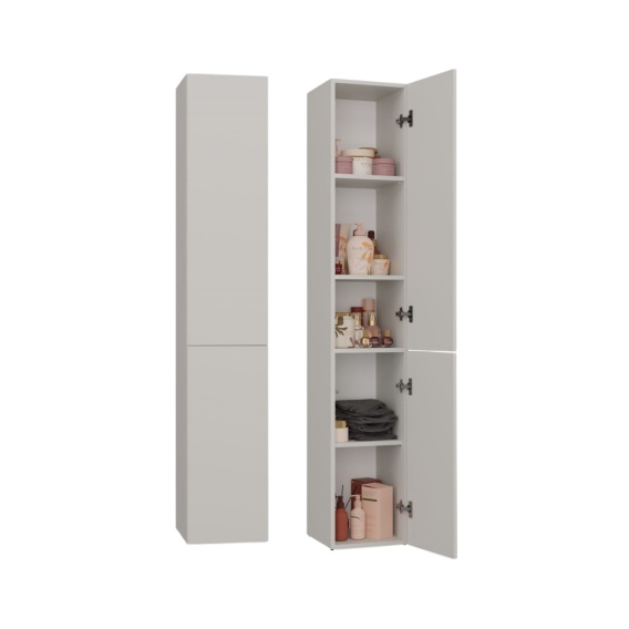 Jednym z największych atutów tego mebla jest zastosowanie systemu TIP-ON. Brak tradycyjnych uchwytów sprawia, że kaszmirowy słupek łazienkowy LAZ-1314-KASZ zachowuje czystą, nowoczesną linię, a otwieranie drzwi staje się dziecinnie proste – wystarczy delikatne naciśnięcie, aby uzyskać dostęp do zawartości półek. To rozwiązanie, które nie tylko zwiększa komfort użytkowania, ale także podkreśla minimalistyczny charakter mebla.