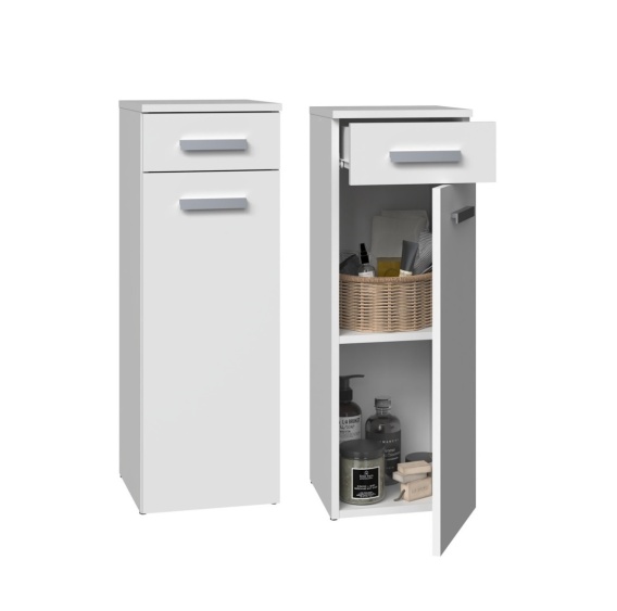 Nasza mała szafka do łazienki LAZ-1317-BIEL-MAT została zaprojektowana z myślą o maksymalnej funkcjonalności. W górnej części znajduje się wygodna w użytkowaniu szuflada, idealna na drobne przedmioty, takie jak kosmetyki czy akcesoria łazienkowe. Poniżej umieszczone są drzwiczki, za którymi kryją się dwie przestronne półki, zapewniające miejsce na ręczniki, środki czystości lub inne niezbędne akcesoria.