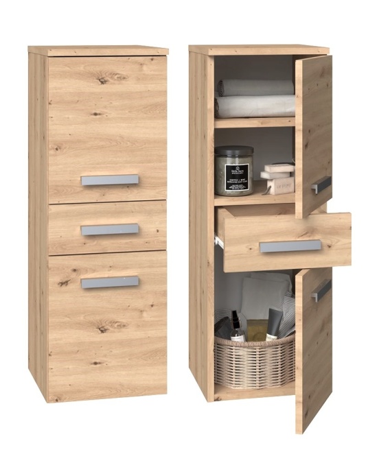 Nasza mała szafka łazienkowa LAZ-1318-ART została zaprojektowana z myślą o maksymalnej funkcjonalności. Wyposażona w dwie pary drzwi – jedne u góry, drugie u dołu – oraz szufladę po środku, oferuje przemyślane rozwiązania przechowywania. Górne drzwi skrywają przestrzeń idealną na kosmetyki i akcesoria, podczas gdy dolne drzwi pomieszczą większe przedmioty. Szuflada to idealne miejsce na drobiazgi, które chcesz mieć zawsze pod ręką.