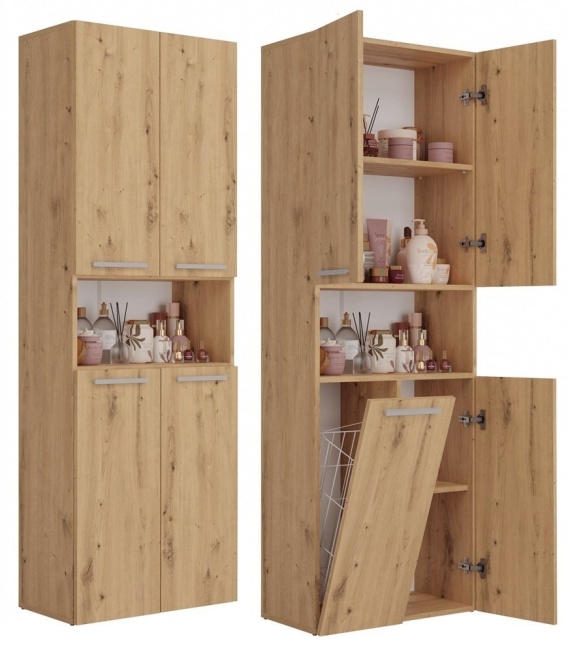 Nasz regal lazienkowy LAZ-1319-ART został zaprojektowany z myślą o praktycznym przechowywaniu wszystkich niezbędnych przedmiotów w łazience. Górne drzwi skrywają dwie pojemne półki, na których z łatwością pomieścisz ręczniki, kosmetyki czy inne akcesoria łazienkowe. Dolna część regału została wyposażona w kosz na pranie, który można zamieniać miejscami z dodatkowymi półkami. Dzięki temu zyskujesz pełną swobodę w organizacji przestrzeni, dopasowując mebel do swoich potrzeb.