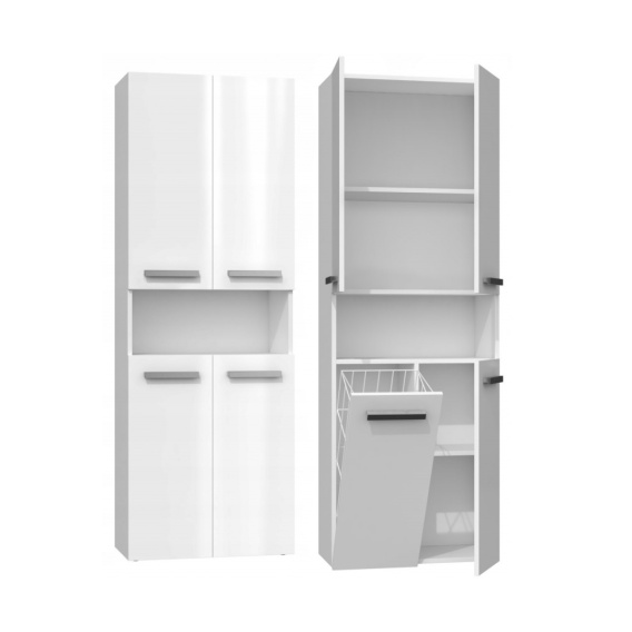 Kolor biały połysk nadaje temu słupkowi do łazienki z koszem nowoczesnego i eleganckiego wyglądu, który doskonale wkomponuje się w każde wnętrze, niezależnie od jego stylu. Białe powierzchnie odbijają światło, optycznie powiększając przestrzeń, co jest szczególnie istotne w mniejszych łazienkach. Srebrne uchwyty do drzwi dodają całości elegancji i ułatwiają codzienne użytkowanie mebla.