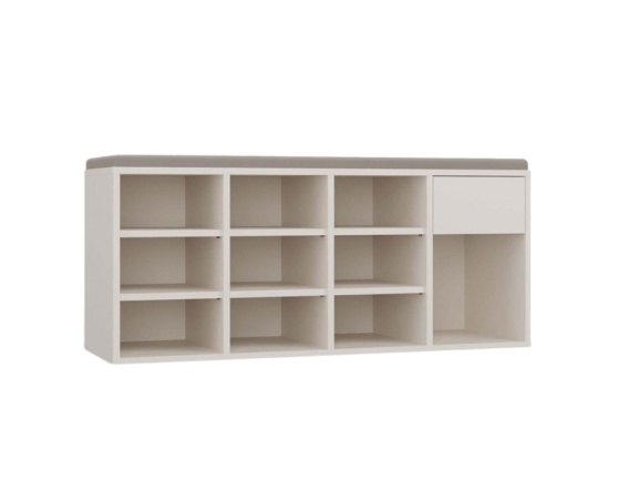 Na górze mebla znajduje się miękkie siedzisko wypełnione gąbką i obite szarym materiałem, które zapewnia wygodę przy zakładaniu czy zdejmowaniu butów. Dzięki temu szafka staje się jeszcze bardziej praktyczna i funkcjonalna.