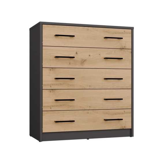 Połączenie kolorów antracytowego korpusu z frontami w dekorze dębu artisan nadaje meblowi wyjątkowy, modny charakter. Całość dopełniają czarne uchwyty – po dwa na każdym froncie – które podkreślają nowoczesny design i dodają elegancji. Szafka prezentuje się stylowo, a jednocześnie jest uniwersalna, dzięki czemu pasuje do różnych aranżacji wnętrz.