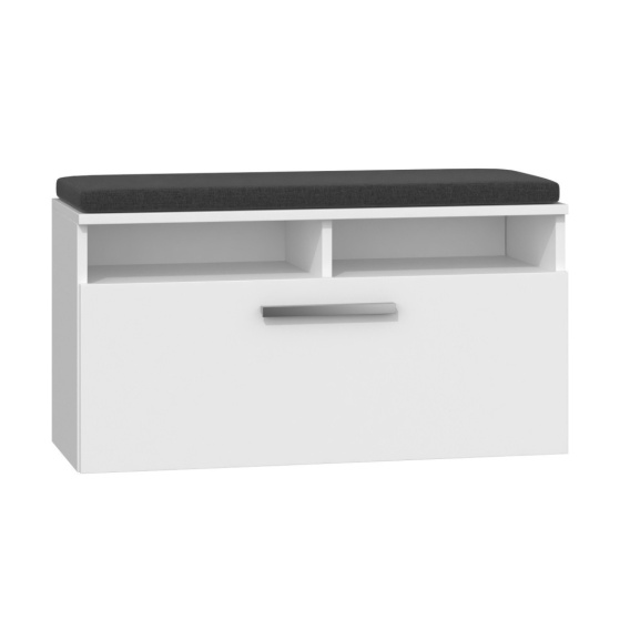 W górnej części szafki znajduje się miękkie, szare siedzisko wypełnione gąbką, które zapewni wygodę podczas zmiany obuwia. Dzięki temu mebel pełni nie tylko funkcję przechowywania, ale również zwiększa komfort codziennego użytkowania. Szafka jest na tyle solidna, że idealnie nadaje się zarówno do małych, jak i większych pomieszczeń.