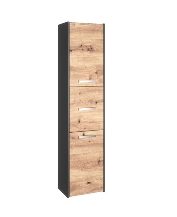 Kolorystyczne połączenie antracytowego korpusu i frontów w odcieniu dąb artisan nadaje szafce na ręczniki do łazienki nowoczesny, ale zarazem ciepły charakter. Prosta, nowoczesna bryła wpisuje się w najnowsze trendy wnętrzarskie, harmonijnie komponując się z różnymi stylami łazienkowymi – od minimalistycznych po bardziej klasyczne aranżacje.