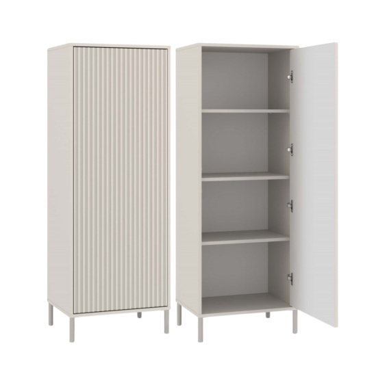 Witryna KOM-936-KASZ-LAM to doskonały wybór do salonu, pokoju gościnnego czy gabinetu. Ryflowany front i system TIP-ON nadają jej nowoczesny charakter, a kompaktowe wymiary ułatwiają dopasowanie do mniejszych przestrzeni. Idealna na książki, dekoracje lub zastawę stołową — doda wnętrzu stylu i porządku.