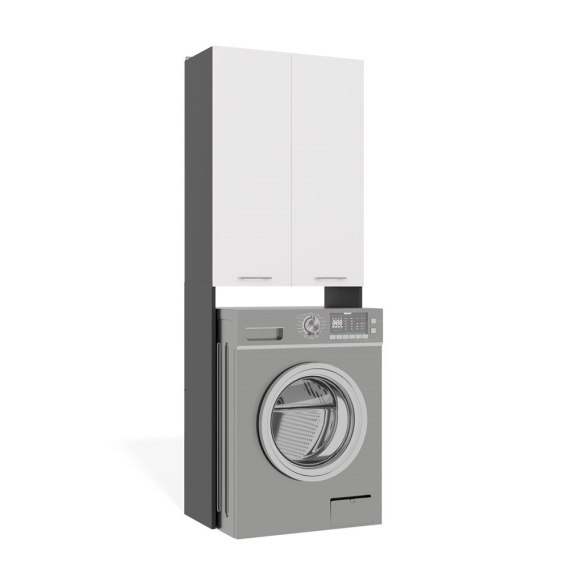 Minimalistyczna forma w połączeniu z kolorystyką antracytowego korpusu i białych matowych frontów tworzy efektowną całość. Zabudowa nad pralkę doskonale komponuje się zarówno w nowoczesnych, jak i bardziej klasycznych aranżacjach, dodając wnętrzu elegancji i lekkości.